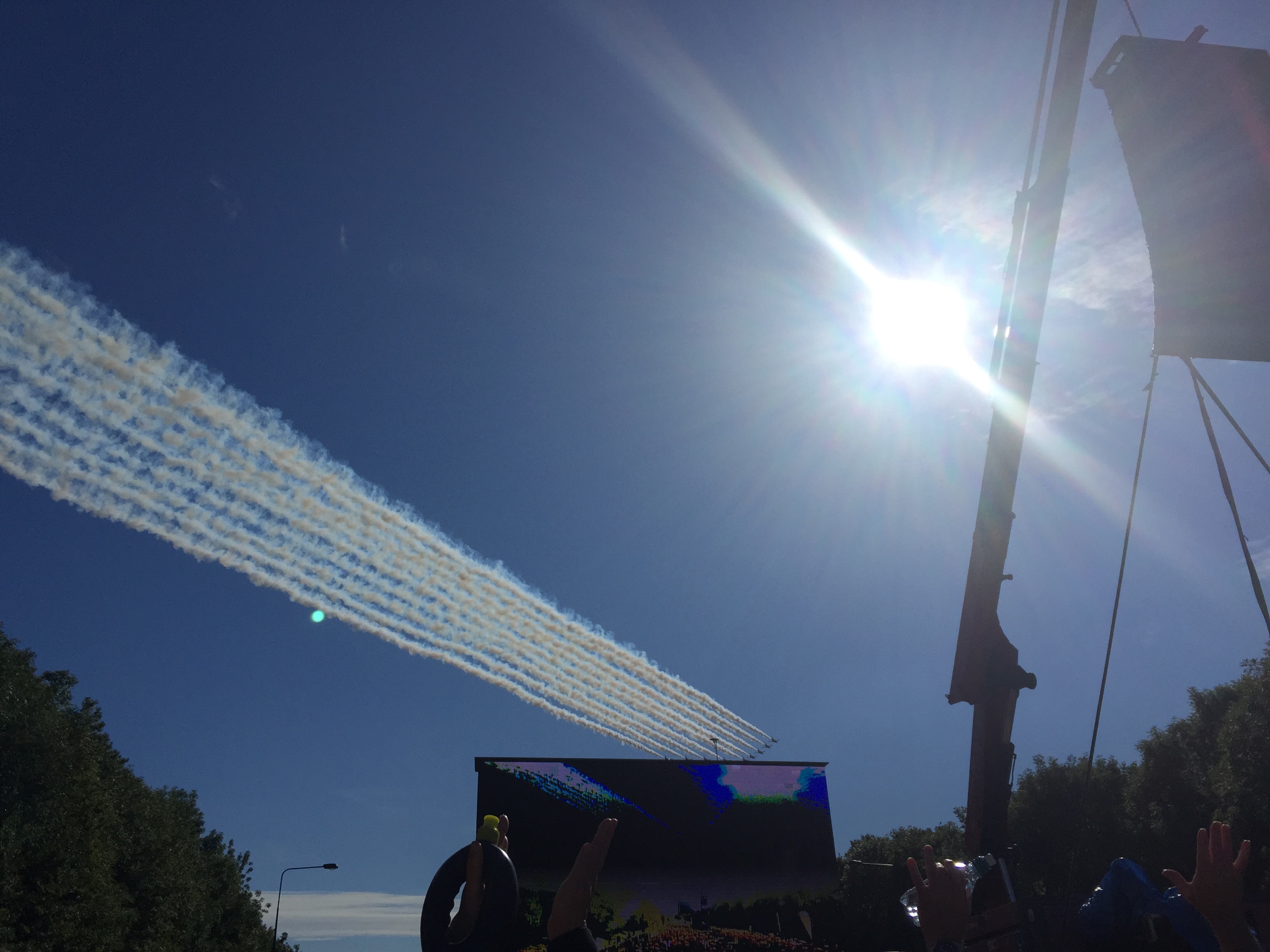 I won’t say that this race flew by – it didn’t. Miles 6 – 9 did, but there were a couple of tough points, too, particularly the hill at mile 11. It wasn’t as bad as I had expected, but it was tough. Just then, the Red Arrows were back overhead, and their aerial display really kept us entertained.