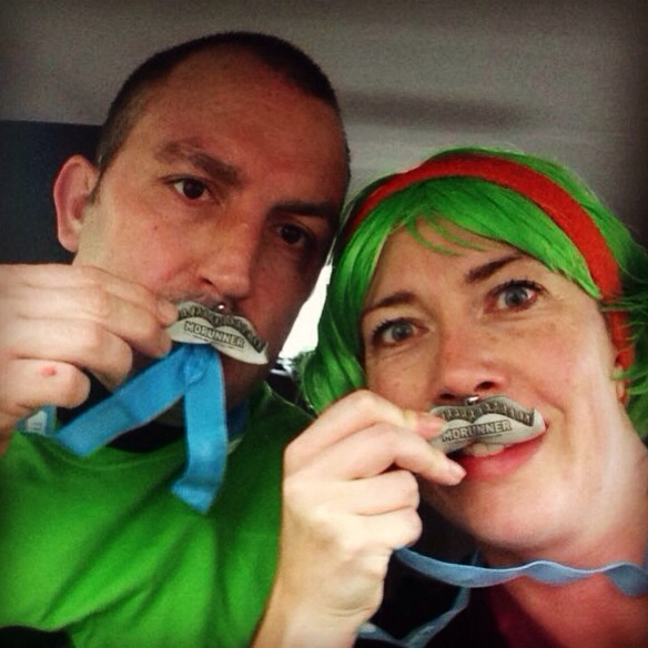 Anyway, we were happy to reach the finish line, and collect our superb MoMedal 😀 and a bottle of lucozade sport. As it was so cold and wet, we didn’t wait about – we headed straight for the car, knowing that a warm shower was only a half hour away!