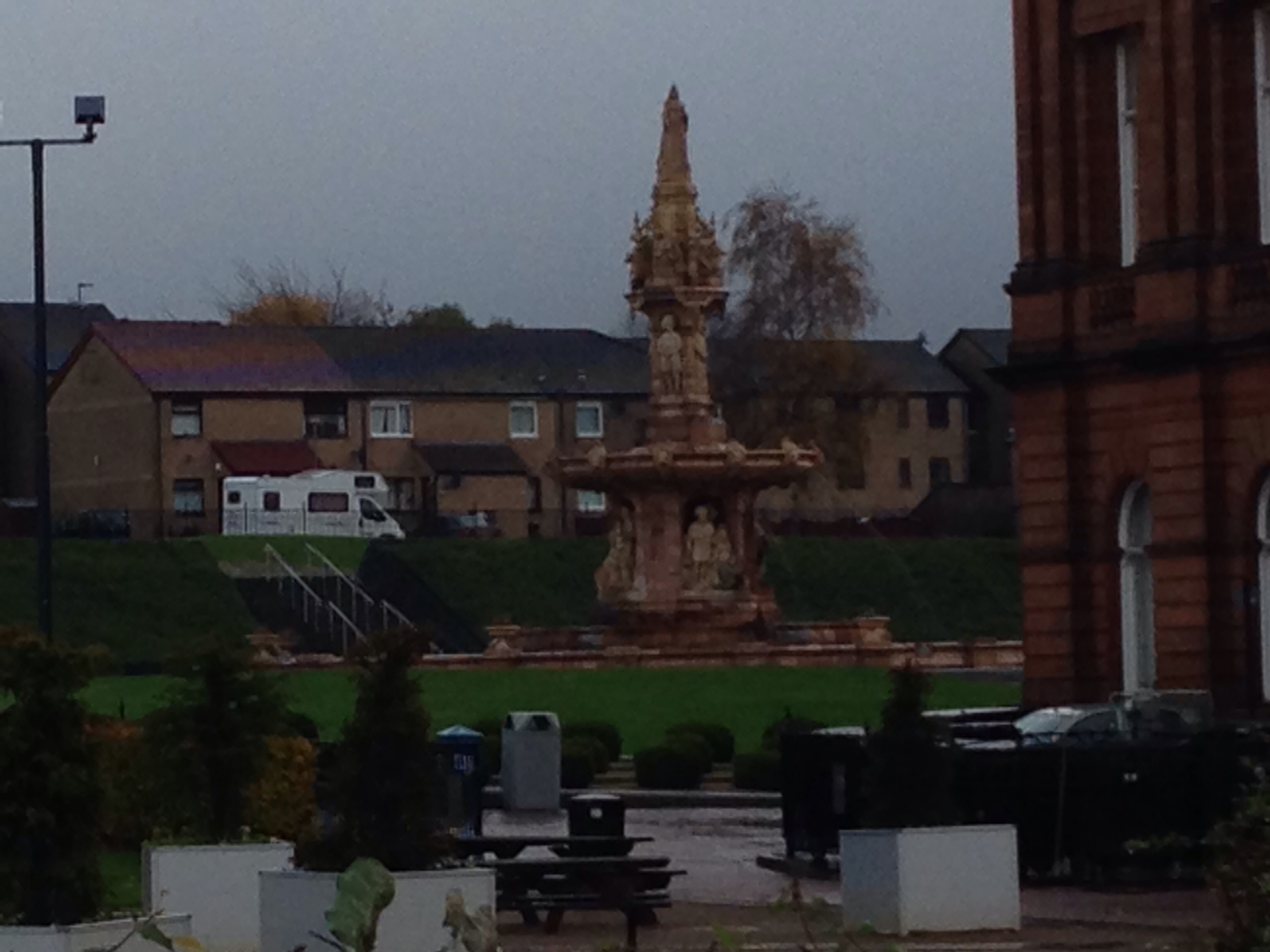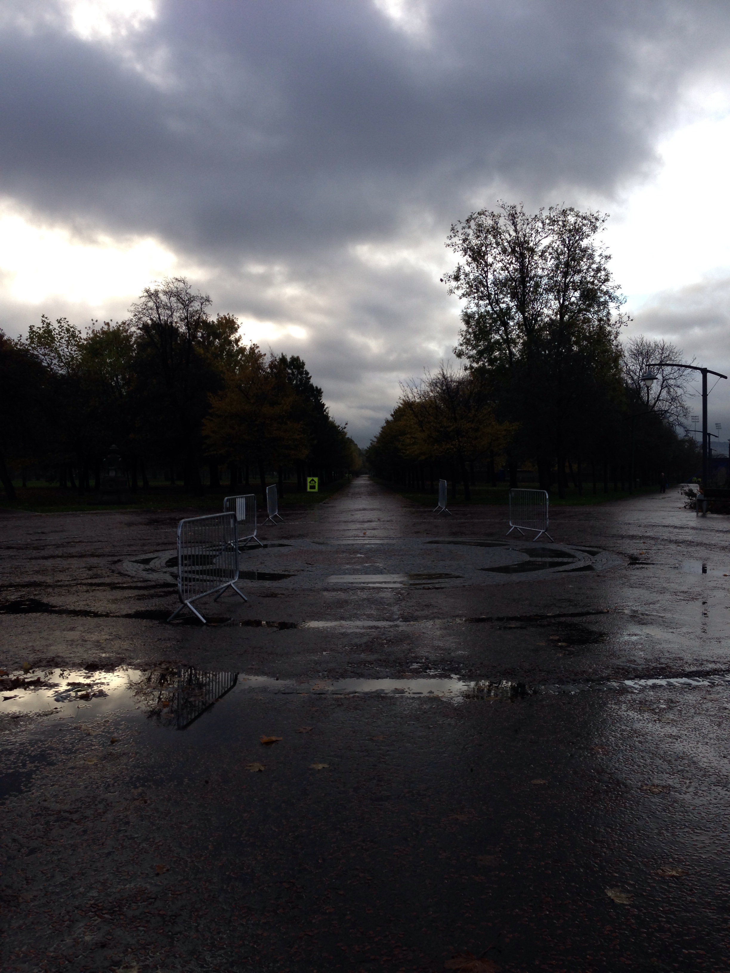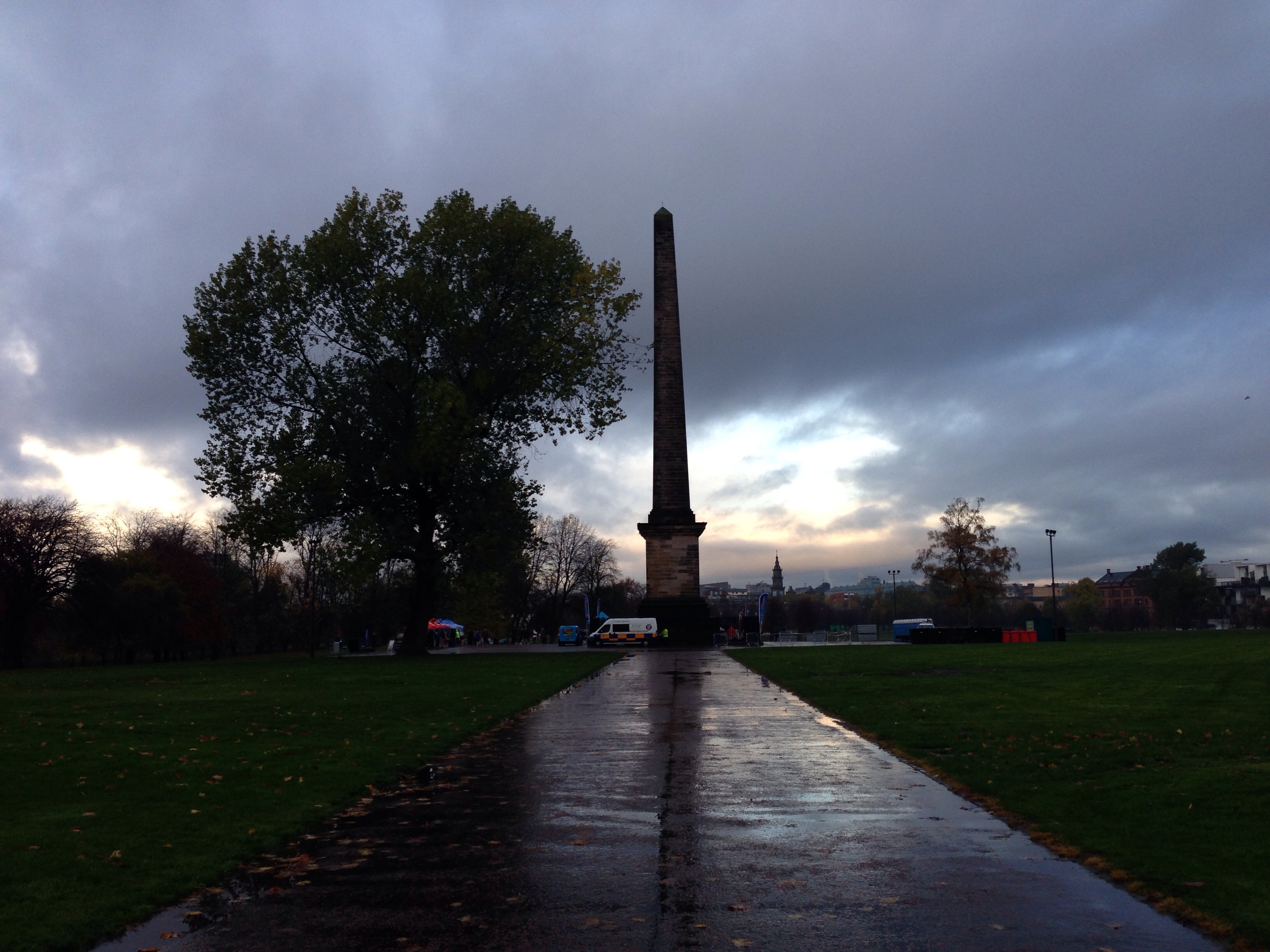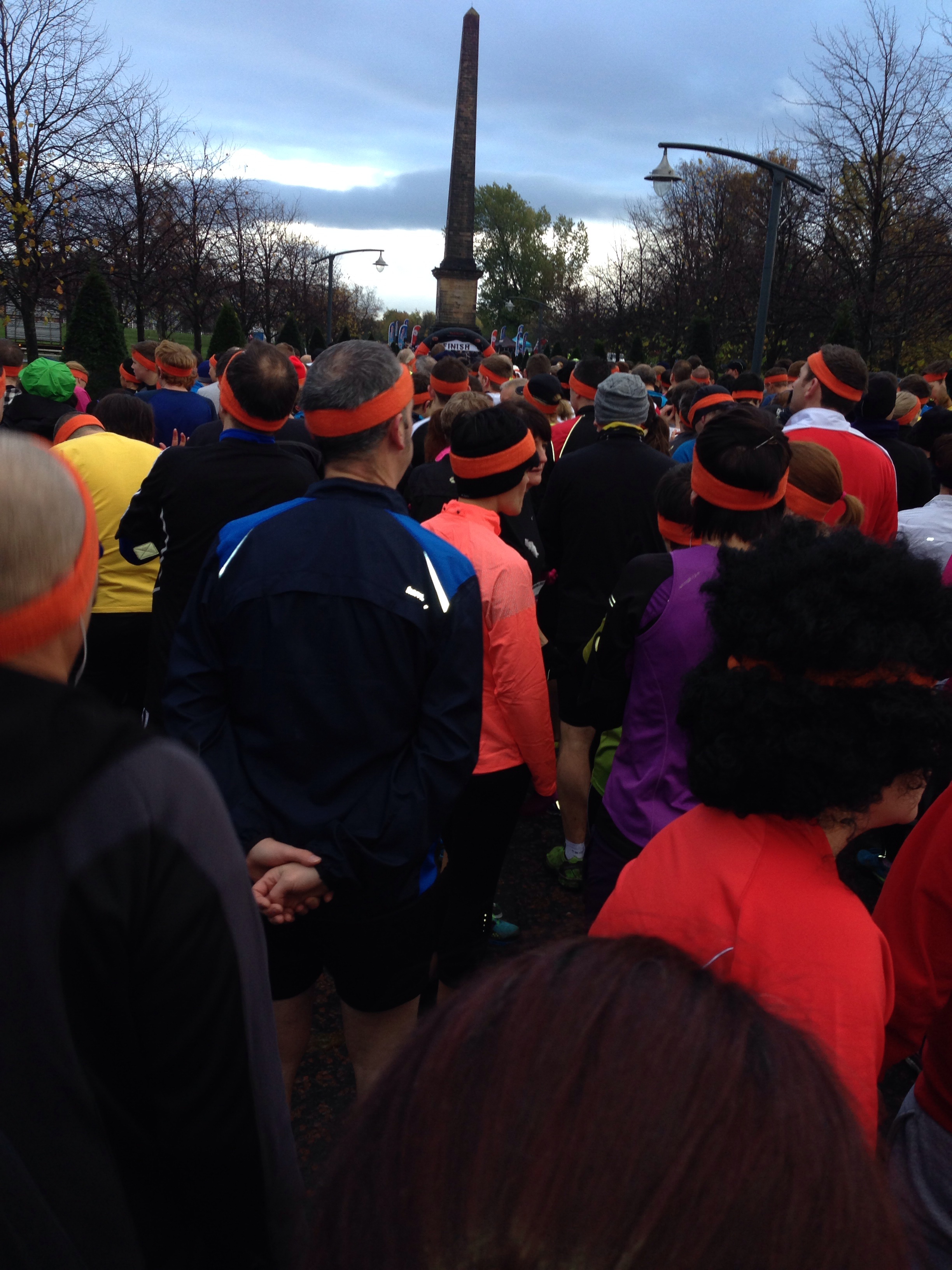 We arrived at Glasgow Green, and parked in the same place as we did for the GSR last month. We walked down to the gazebos, in the rain, to pick up our race packs and our head bands. It was so cold! But the park was looking beautiful!